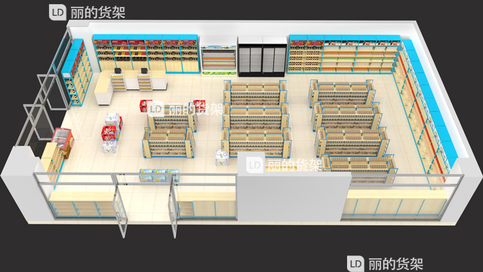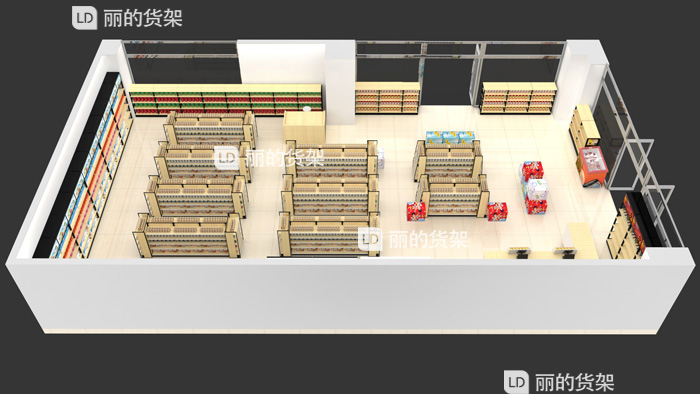 下面来看看丽的货架为一家便利店做的货架布局效果图。陈列展示木制货架,三个角度两个颜色,提供客户选择,中岛区域的货架布置是呈三角形,总共为九组中岛货架。三面墙都是单面货架铺满,下面来看看下面图中的货架配置: